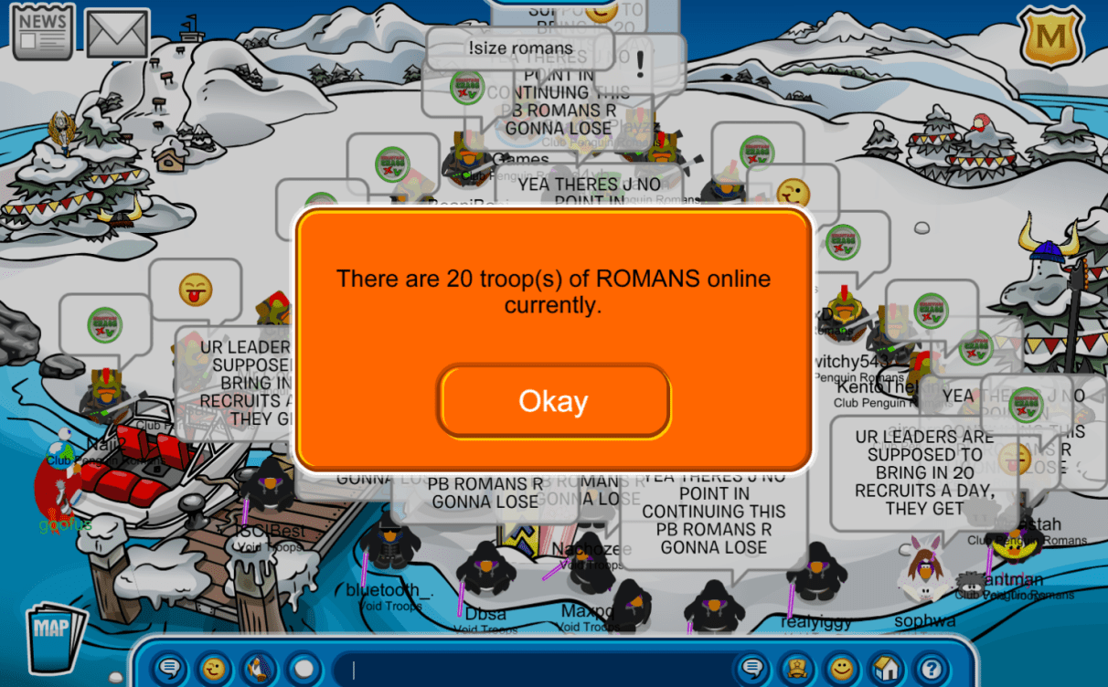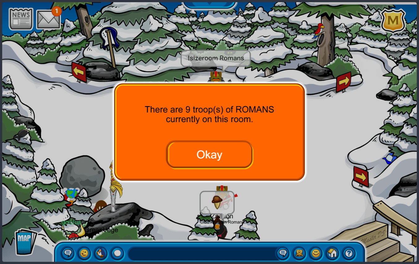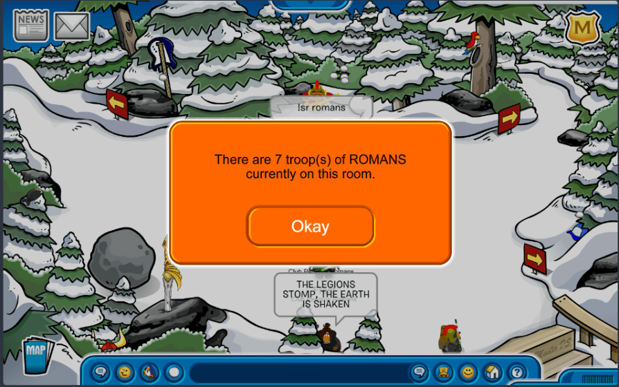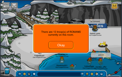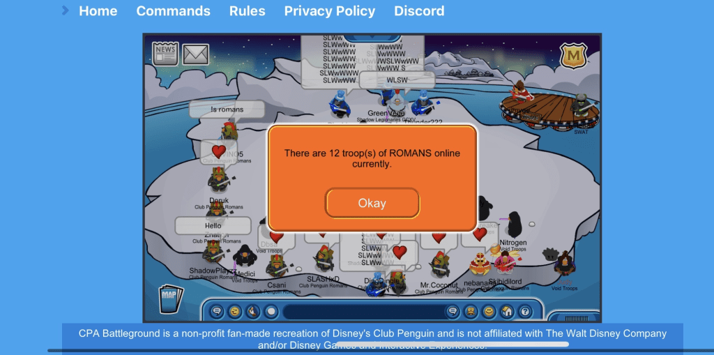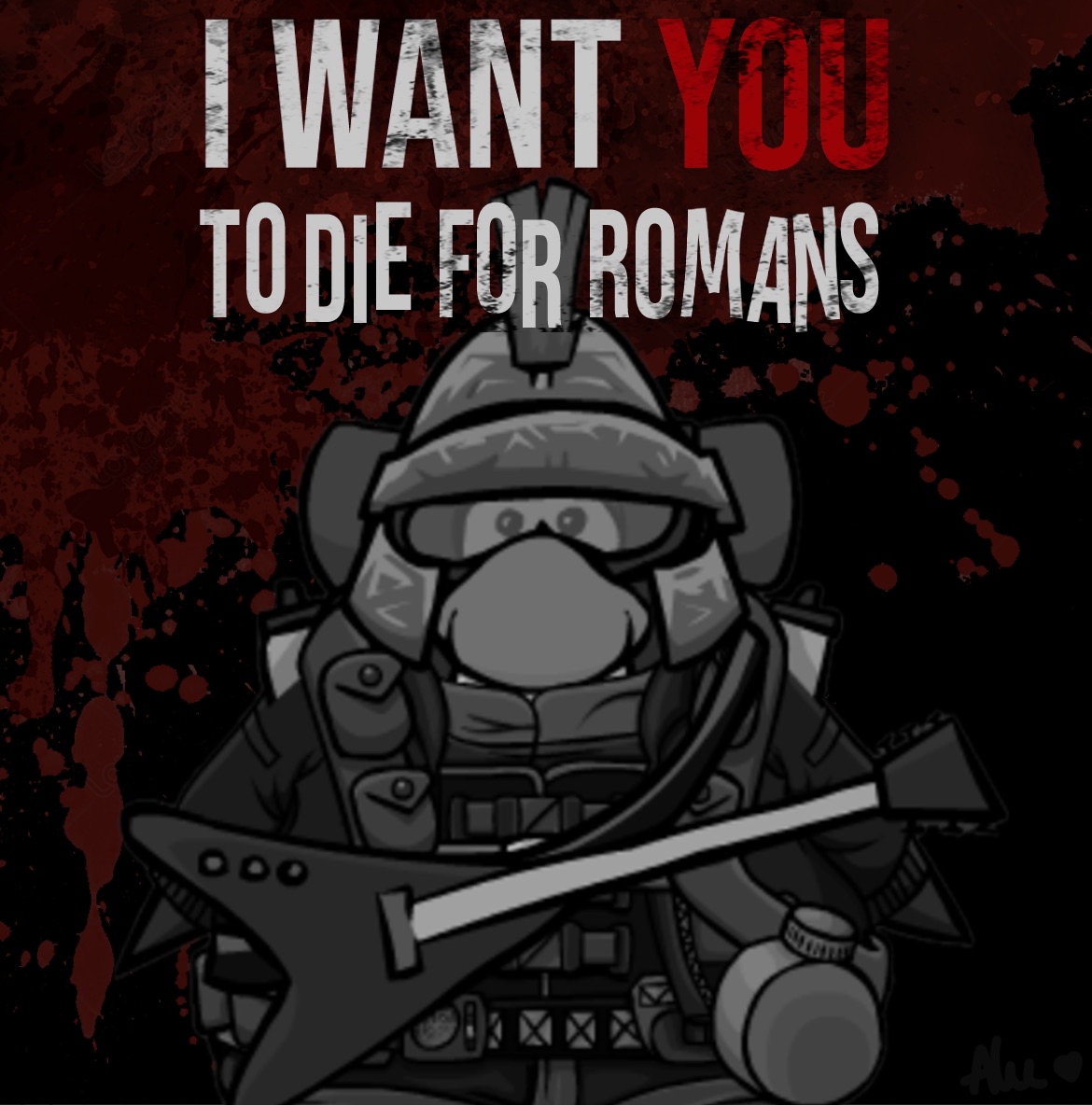 Welcome to the Club Penguin Romans! We are one of the oldest and most resilient armies of Club Penguin, with a lineage stretching back to 2006. Our goals are to provide our members with a unique, fun experience and give our enemies a fight they'll never forget. If you would like to join, click on the join button on the right-hand sidebar, which will redirect you to our Discord server for intake. We hope you enjoy your stay with us!