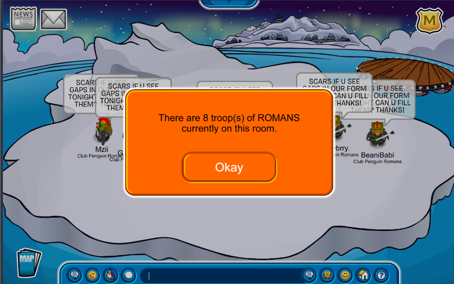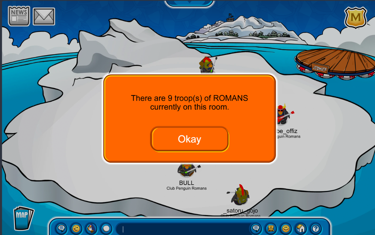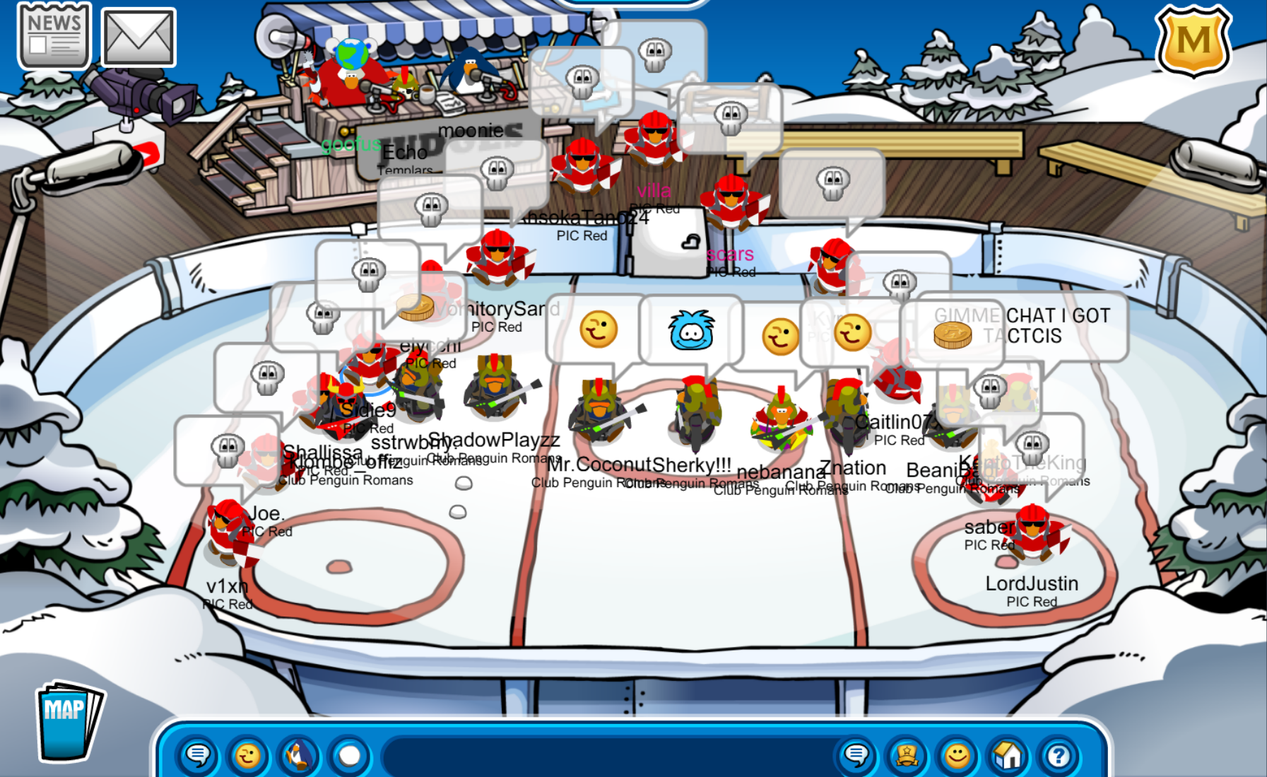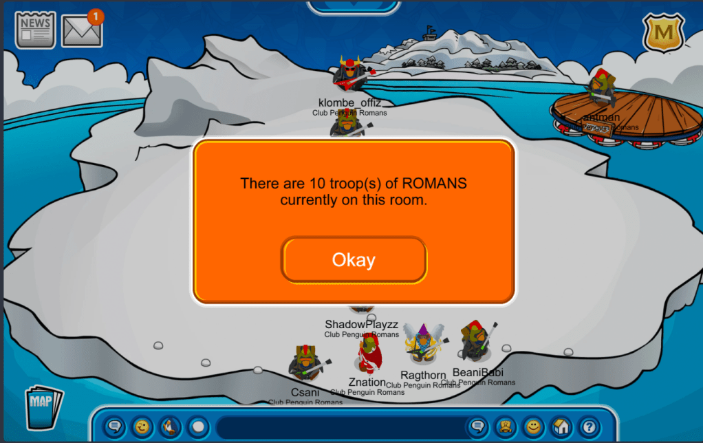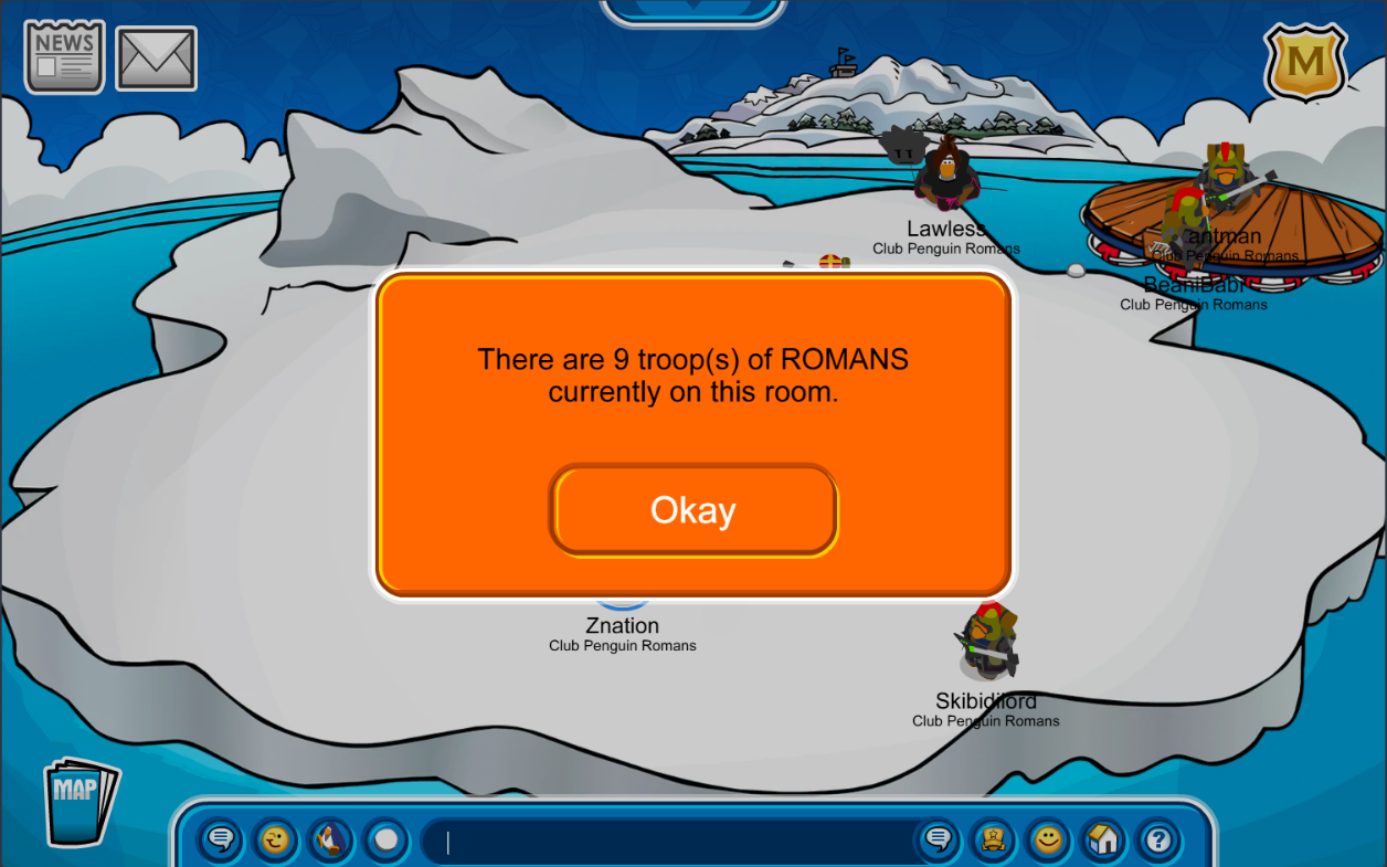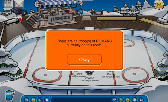 Ave Roma! Today, we had our practice battle with the Army of Club Penguin’s division. We logged on to the Stadium for the pre-rooms, and the event was 15 minutes long, so we headed to the Pet Shop in the Plaza. The event went pretty well, and we maintained a consistent maximum of 10.