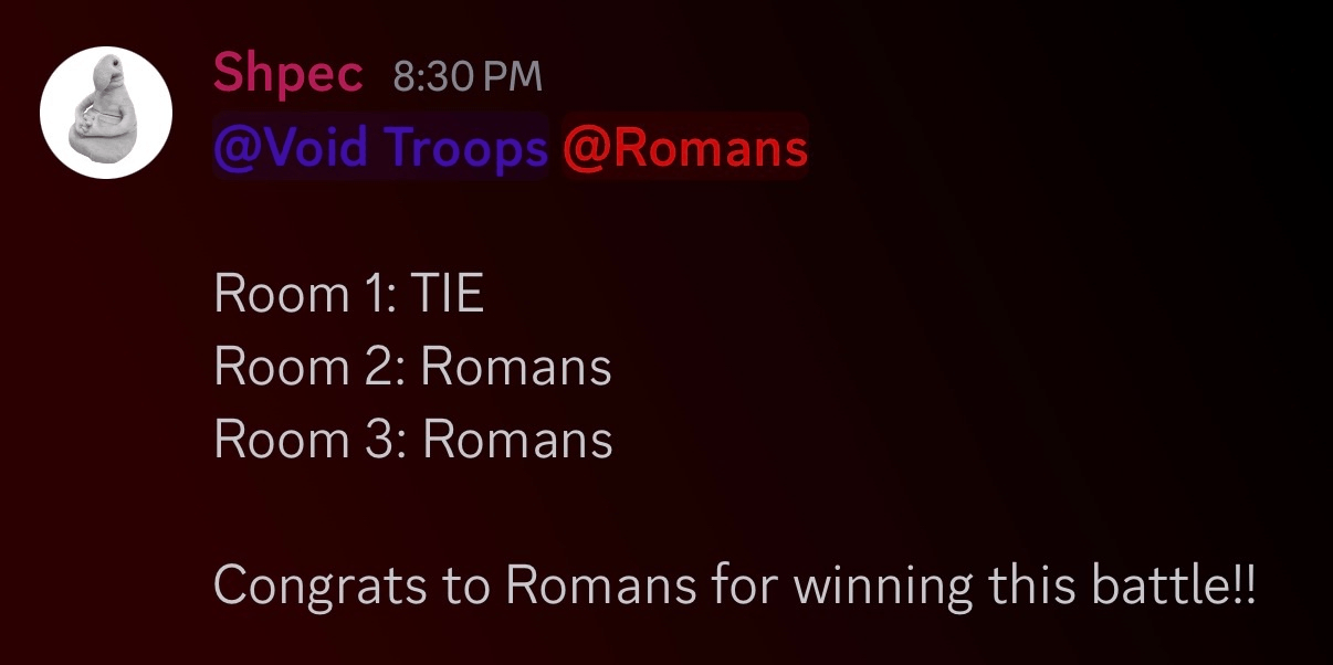 Ave Roma! Today we had our battle against shreks led by Judy and znation. Judy led R1, which went smoothly, and our goat and savior znation led R2 and R3, which went amazingly as znation carried Romans to victory. shreks maxed 4, but this is the first battle romans has won under znations leadership so znation is very happy about it.