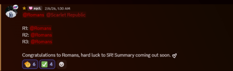 Ave Roma! Today we had our battle with SL, which went pretty well. Early hype in the battle, and we did decent in the beginning, and had a good battle overall. We swept the battlefield. I led r1 and r2 while csani led r3 and it went pretty well.