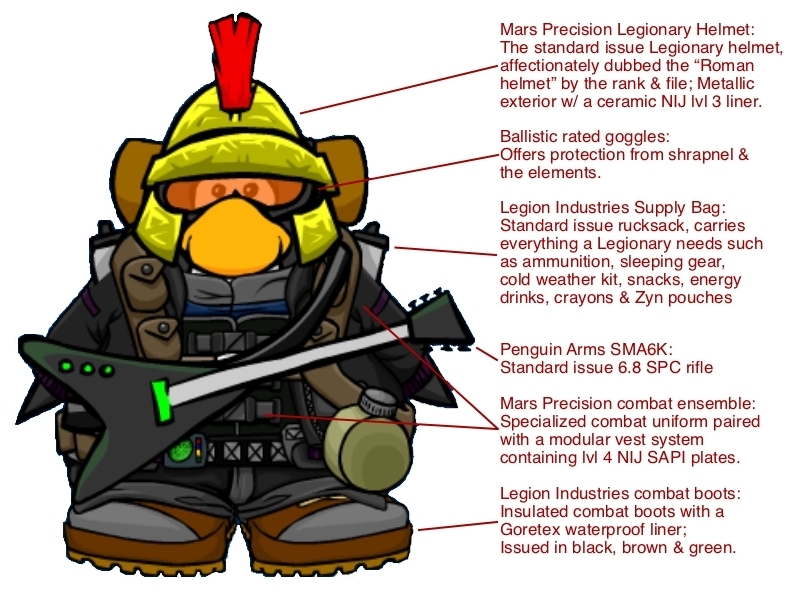 The new uniform standard brings us back to the Roman’s original, primarily black aesthetic, and makes use of rarely used Elite Gear pieces to give our Legionaries more of a tactical look over ye olde red football jerseys. Funnily enough, this is the uniform we were looking at adopting for our first CPPS attempt all the way back in 2012 (or was it 2013?), before we opted for something that could readily be used on both private servers and vanilla Club Penguin. The components of the uniform, plus their associated item codes, are listed below: