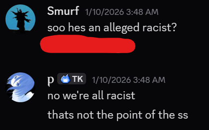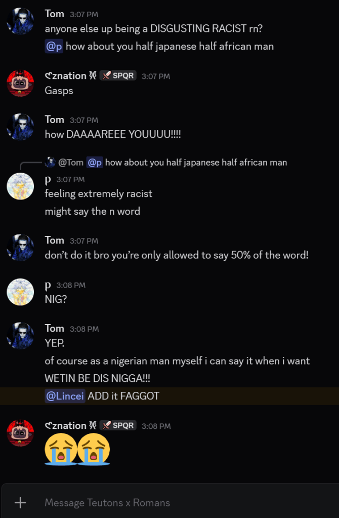 And beyond his actions against these communities, Justin is also a motherfucking racist, conduct that further reflects the character of those now standing with the Teutons.