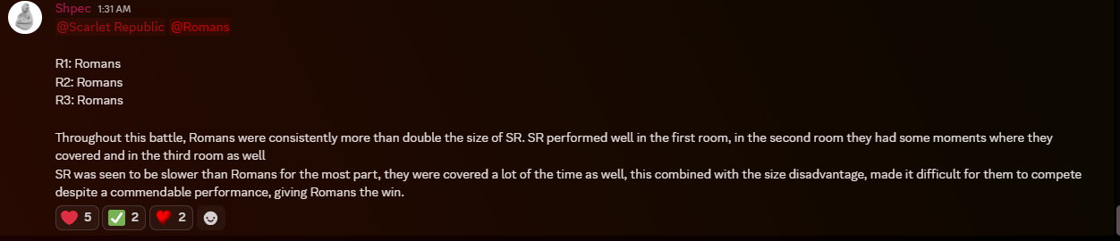 Ave Roma! Today we had our battle against shreks led by Judy and znation. Judy led R1, which went smoothly, and our goat and savior znation led R2 and R3, which went amazingly as znation carried Romans to victory. shreks maxed 4, but this is the first battle romans has won under znations leadership so znation is very happy about it.
